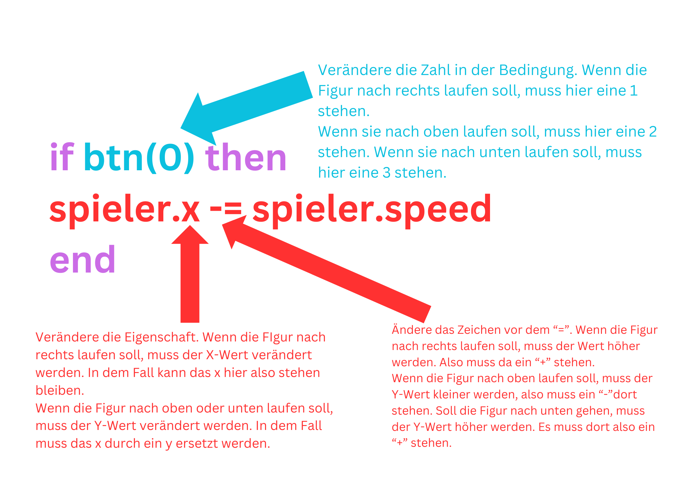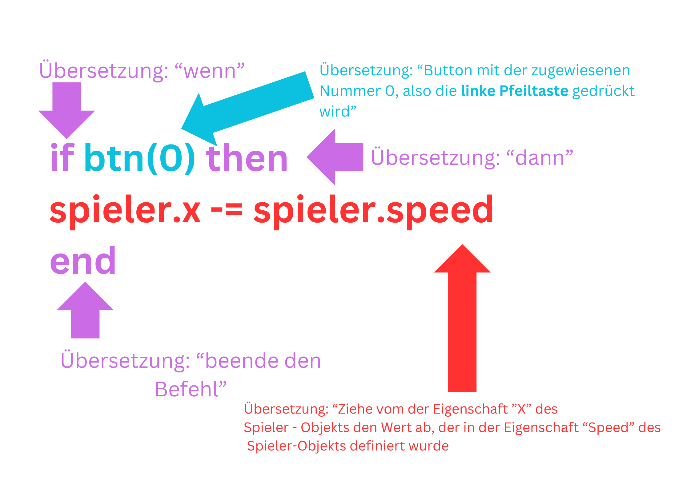 | „Wenn der Spieler die linke Pfeiltaste drückt, bewege die Figur nach links.“ | if btn(0) then spieler.x -= spieler.speed end |