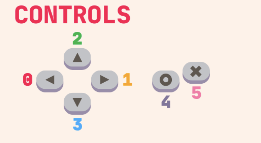 - Die Wörter in TÜRKIS bilden die BEDINGUNG. BTN(0) lässt sich übersetzen als: Button mit der zugewiesenen Nummer 0 ist gedrückt worden. Aber warte mal – was hat es mit der „zugewiesenen Nummer 0“ auf sich? Soll sich die Figur nicht nur dann bewegen, wenn man die linke Pfeiltaste drückt, und nicht die Taste 0? In Pico 8 funktioniert das etwas anders. Jede Pfeiltaste sowie Aktionstaste hat eine Zahl zugewiesen bekommen, die wir beim Schreiben der Bedingung „übermitteln“ müssen. Du kannst die Zuordnung auf dem folgenden Bild sehen:
