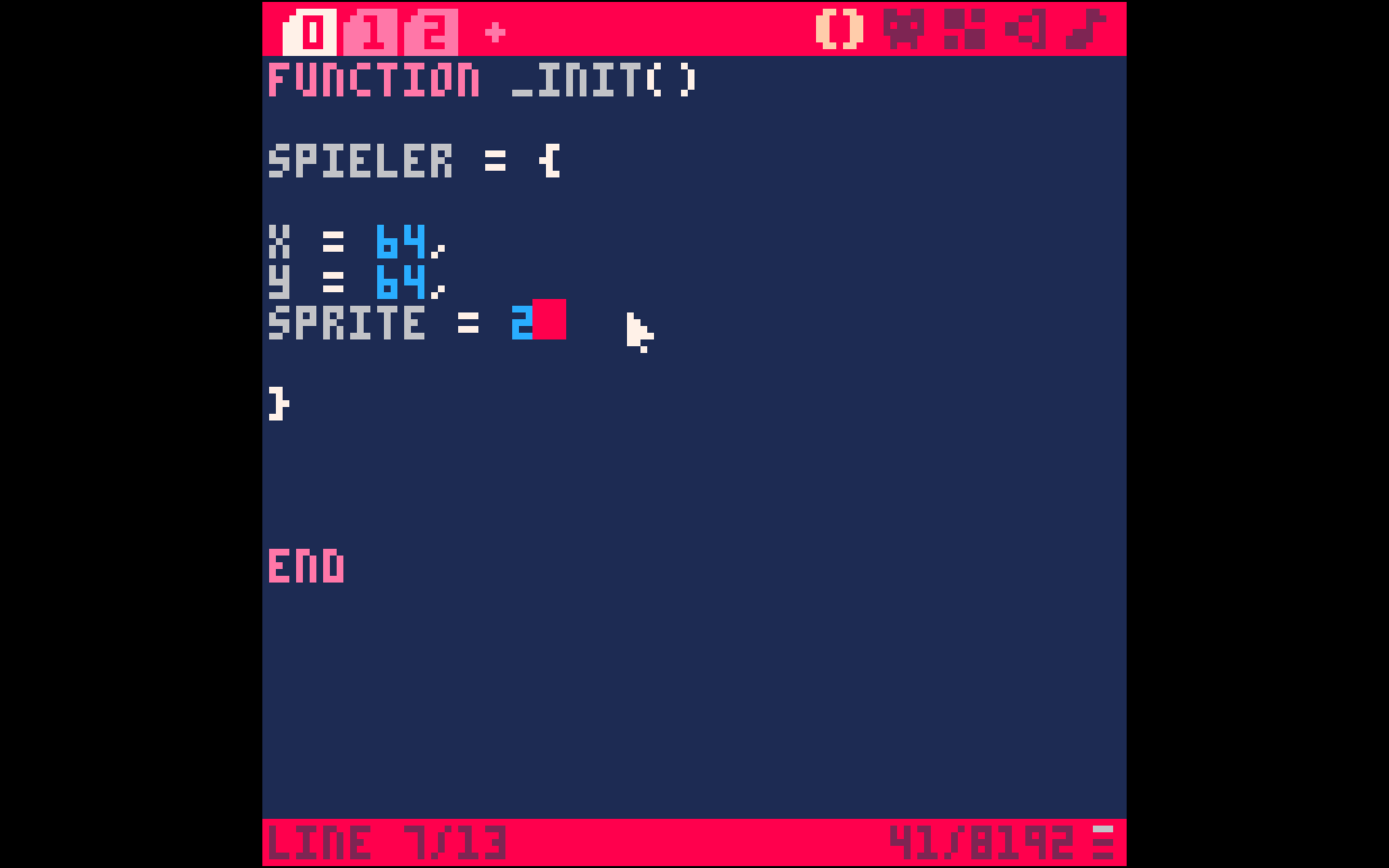 Programme sind leider nicht sehr intelligent. Würden wir Pico-8 befehlen: „Bewege die Figur nach links“, könnte es mit diesem Befehl nicht viel anfangen – die Anweisung wäre zu „ungenau“. Wir müssen dem Programm GANZ GENAU sagen, was es tun soll.