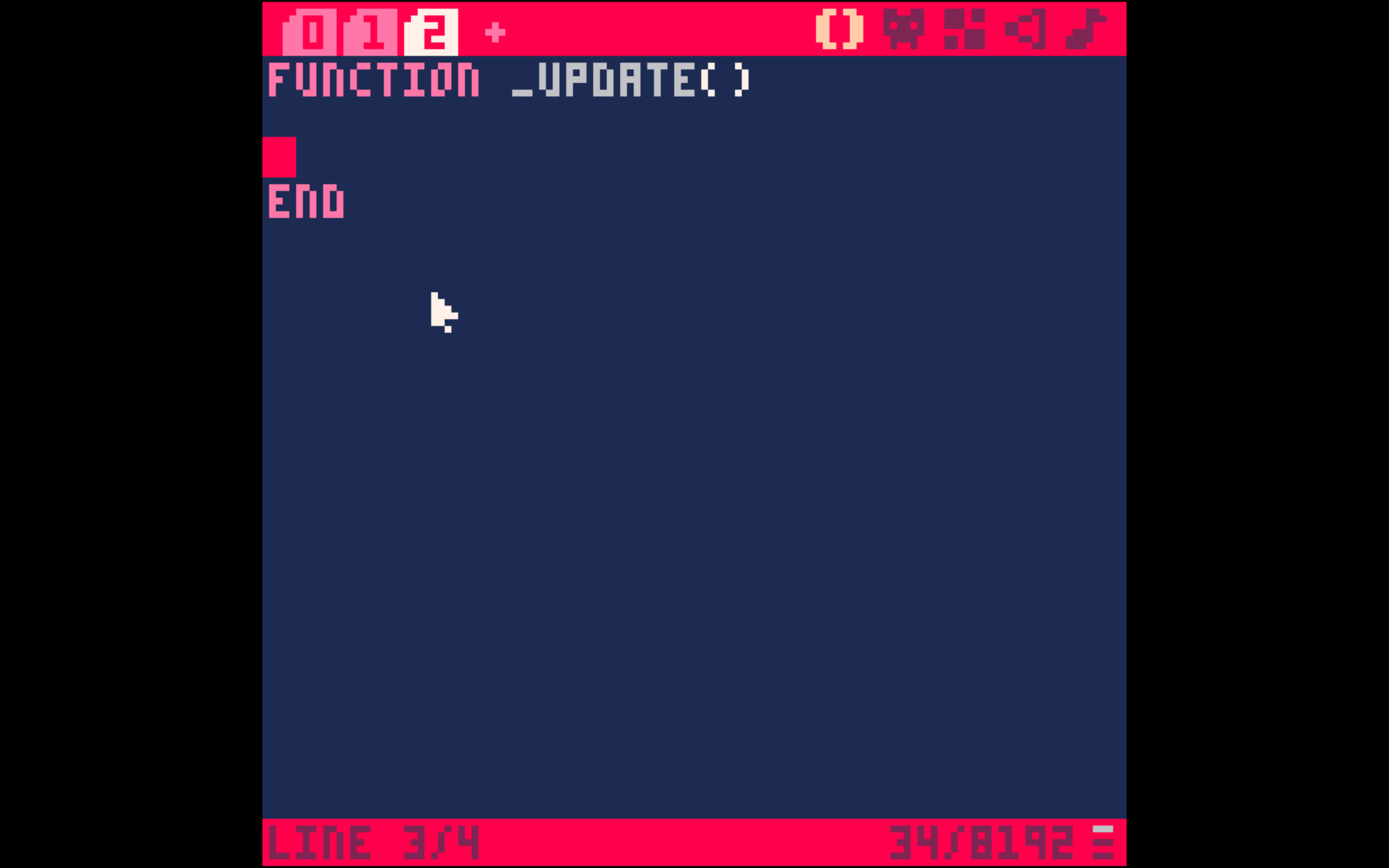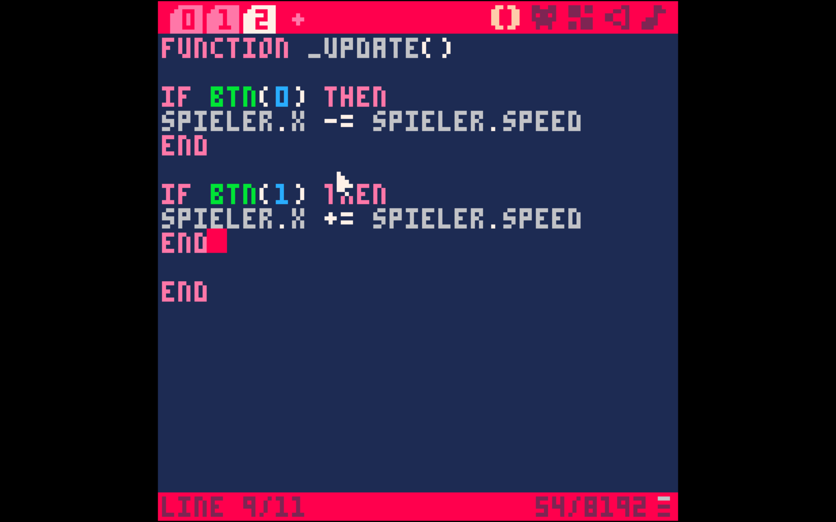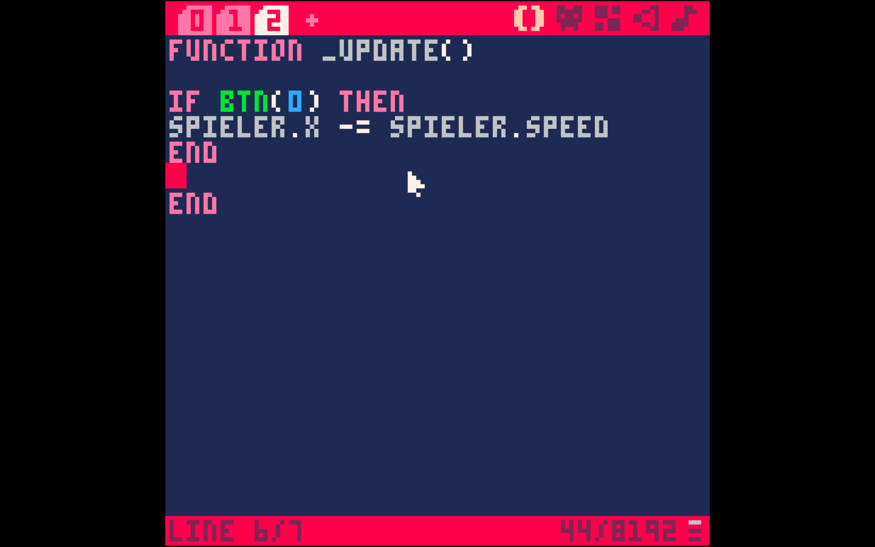 Wir können nun unsere LUA-Anweisung (Wenn die linke Pfeiltaste gedrückt wird, bewege die Figur nach links) in unsere _update() Funktion einfügen. Kopiere hierfür den folgenden Code mit command und c und füge ihn in Pico 8 ein, in dem du command und v drückst.