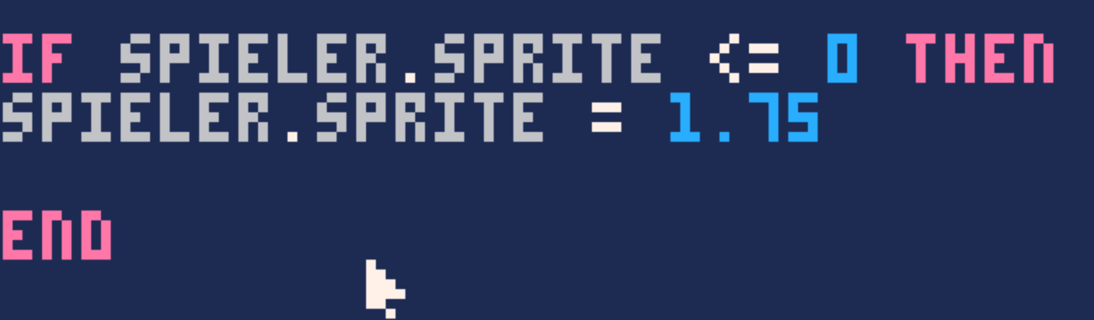 | if spieler.sprite <= 0 or spieler.sprite >= 2 then spieler.sprite = 1.75 end | Wenn der Wert in der Eigenschaft „Sprite“ unseres Spieler-Objekts KLEINER oder GLEICH 0 ist ODER Wenn der Wert in der Eigenschaft „Sprite“ unseres Spieler-Objekts GRÖßER oder GLEICH 2 ist DANN Setze den Wert in der Eigenschaft „Sprite“ unseres Spieler-Objekts wieder auf 1.75 |