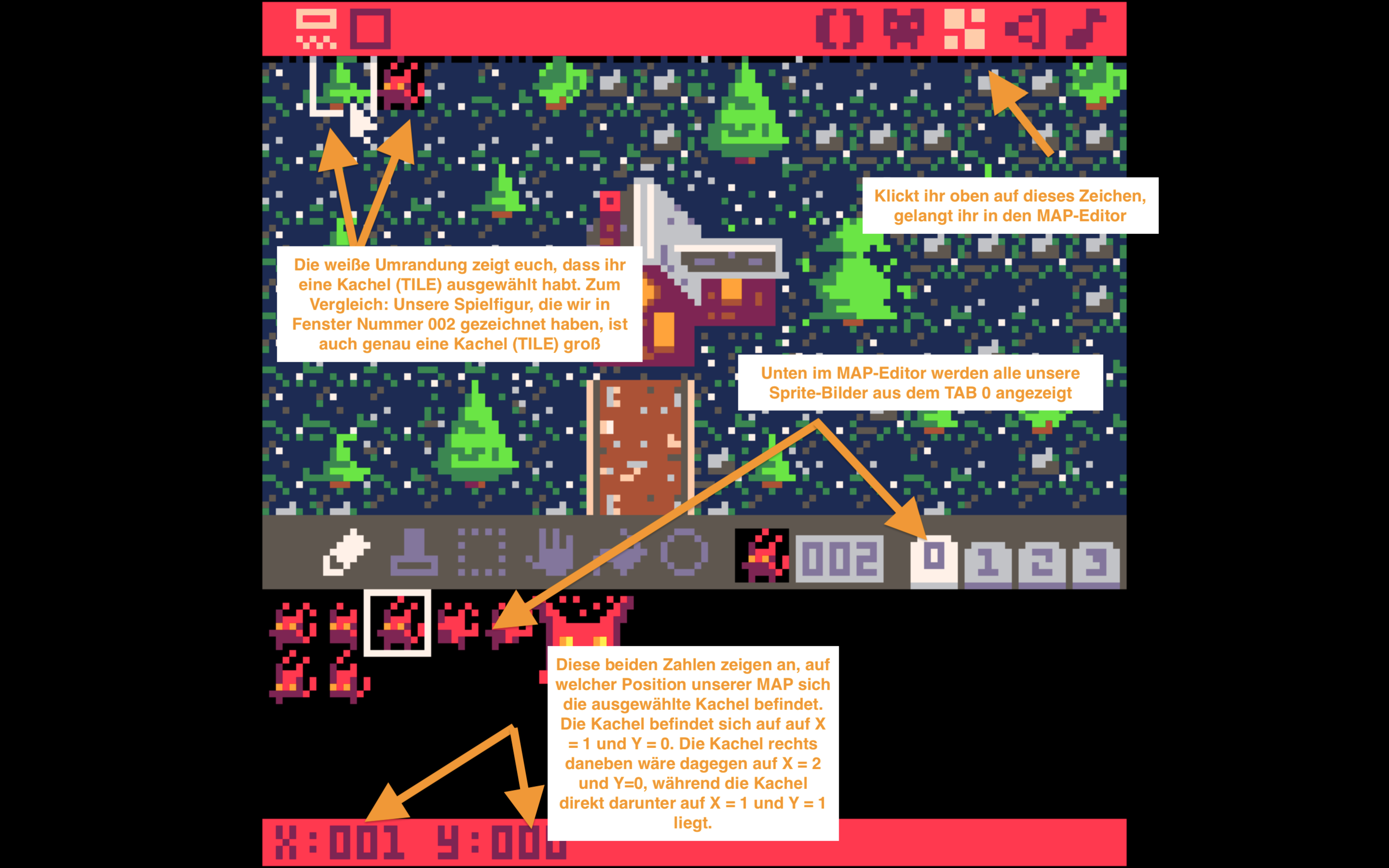 Wechselt nach dem Zeichnen in den MAP-Editor (Das Symbol rechts neben dem Sprite-Editor.