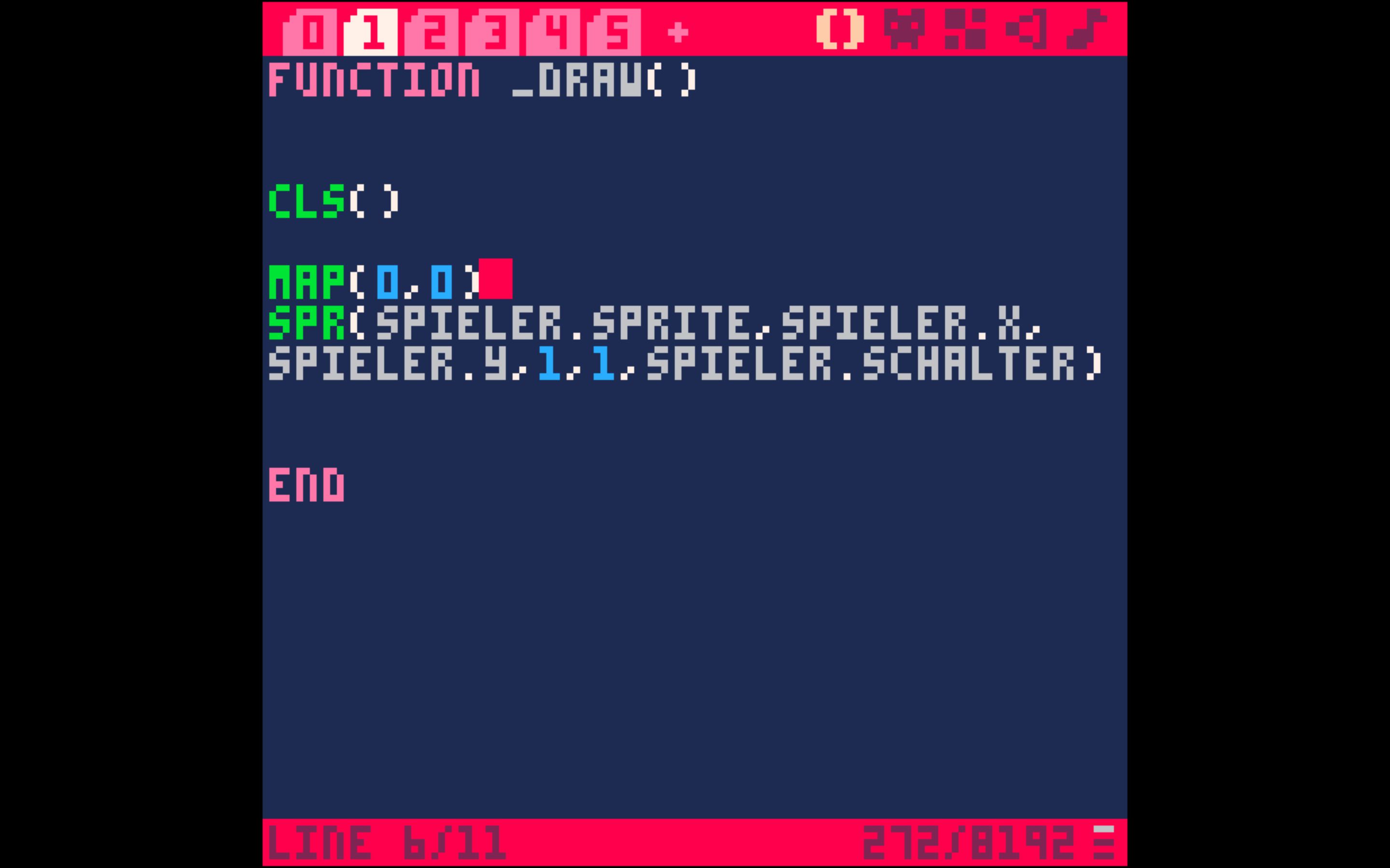 Deine Map ist fertig. Wenn du das Spiel startest, erscheint die MAP aber noch nicht auf dem Spielfeld. Um das zu ändern, gehe auf TAB 1 in die _draw() Funktion und füge eine Zeile überhalb der spr() Funktion den folgenden Code ein: