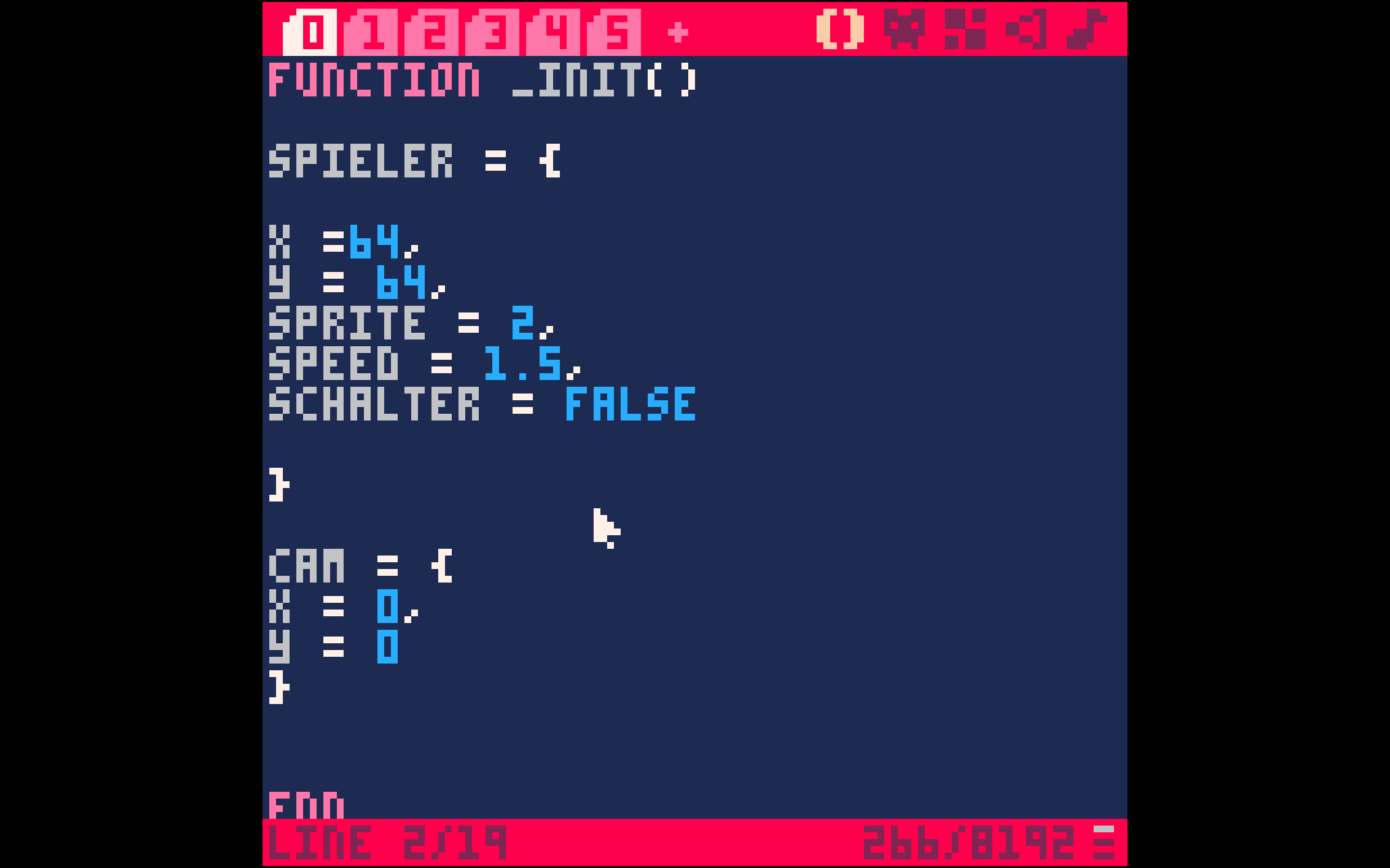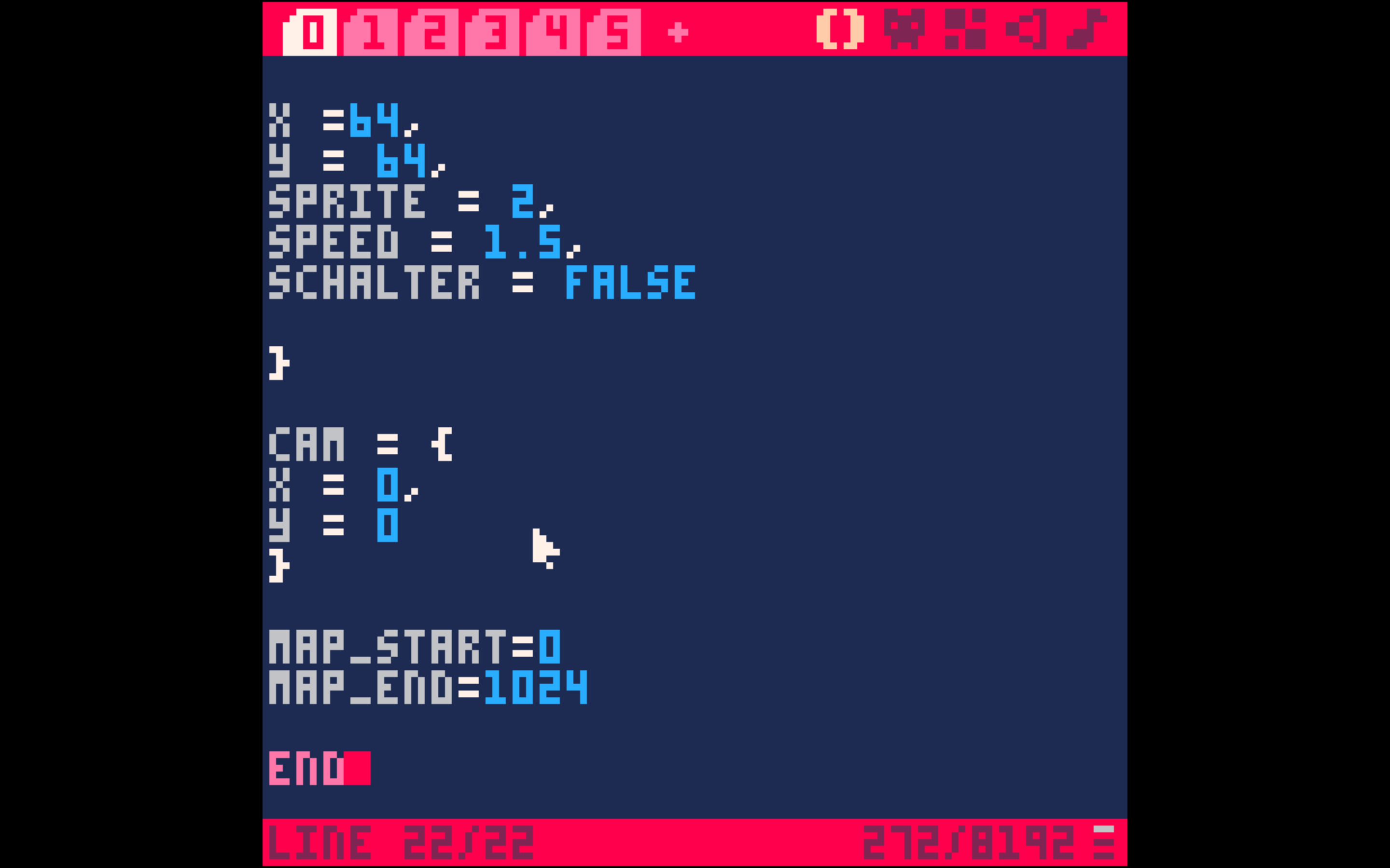 Im nächsten Schritt müssen wir Pico-8 noch mitteilen, wo unsere MAP startet und wo sie endet. Ansonsten würde sie noch über den Kartenrand mitlaufen, was im Spiel seltsam aussehen würde. Wir könnten wieder ein Objekt namens „Karte“ anlegen und dort zwei Eigenschaften „Anfang“ und „Ende“ mit den jeweiligen Werten festlegen. Wie wir Objekte anlegen, kennen wir aber schon. Stattdessen probieren wir mal einen anderen Weg. Anstatt Werte in Objekten zu speichern, können wir auch einfach schnell zwei VARIABLEN anlegen.
