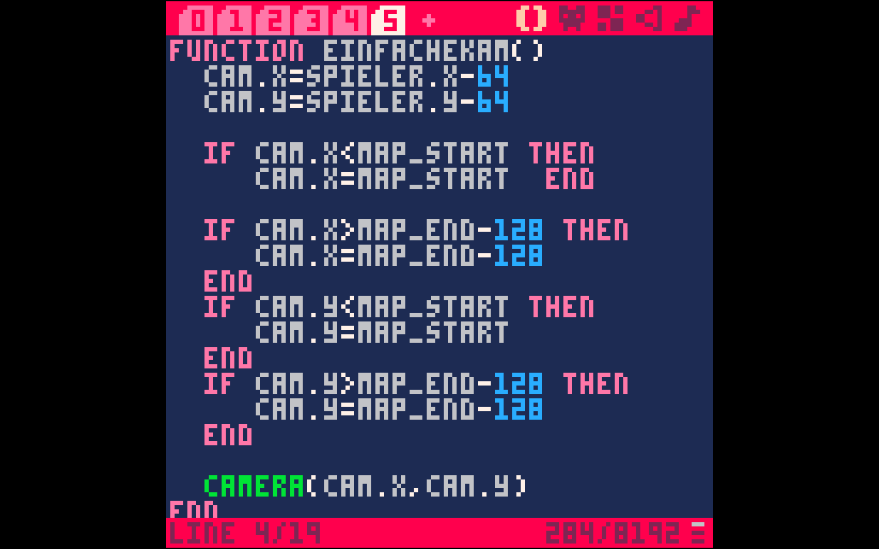 Anschließend werden einer Pico8-Funktion namens „Camera“ die Werte aus unserem Objekt Cam.X und Cam.Y übermittelt. Diese Werte braucht die Funktion, damit sie die Kamera bewegen kann.