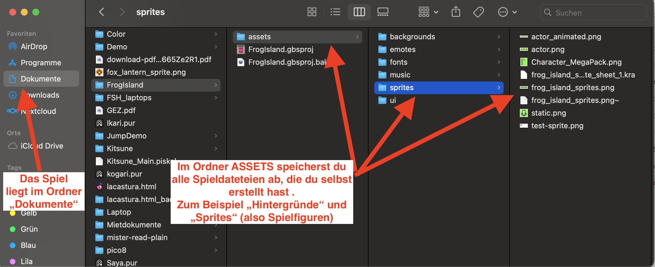Damit wir unser eigenes Spiel erstellen können, müssen wir eigene oder fremde Bilder in das Spiel laden. Klassischerweise fügen wir hierfür die Dateien direkt in die jeweiligen GB-Studio Ordner ein. Dein Projekt wird normalerweise im Ordner „Documents“ oder „Dokumente“ gespeichert. Um dort hinzukommen, drücke command und die Leertaste. Tippe dann „Finder“ ein. Klicke auf dein Projekt. So sieht die Ordnerstruktur aus:
