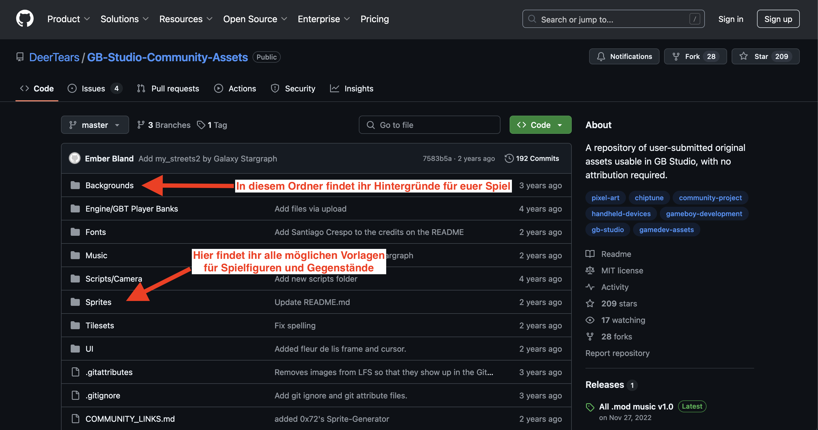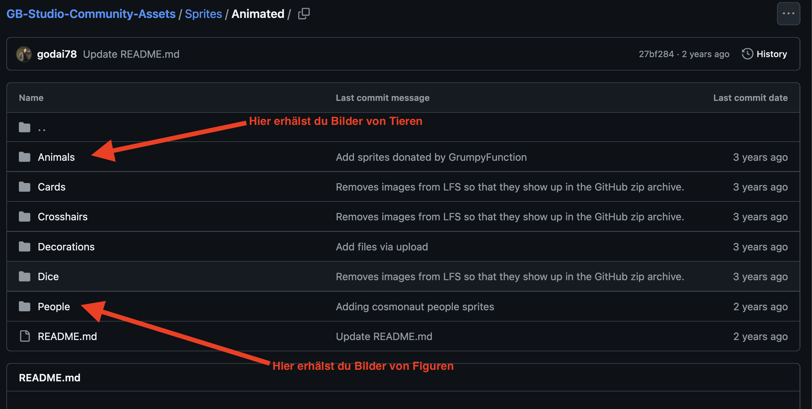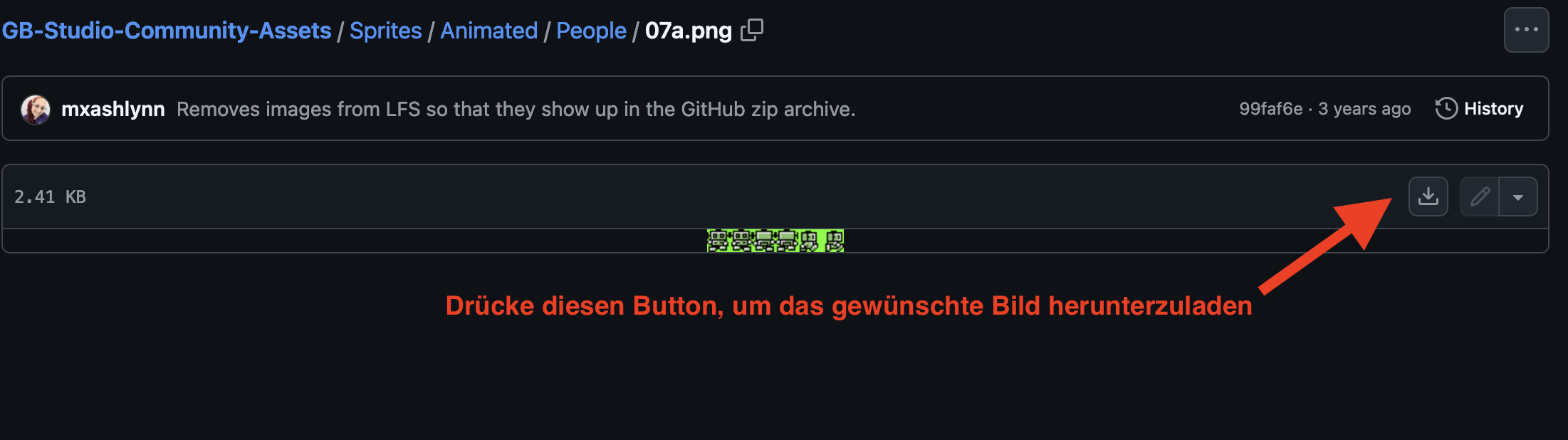 Vielleicht traust du dir noch nicht zu, eine eigene Figur zu zeichnen – oder du willst erstmal ausprobieren, wie das Programmieren mit GB Studio überhaupt funktioniert, ohne vorher aufwendig Figuren zu zeichnen.