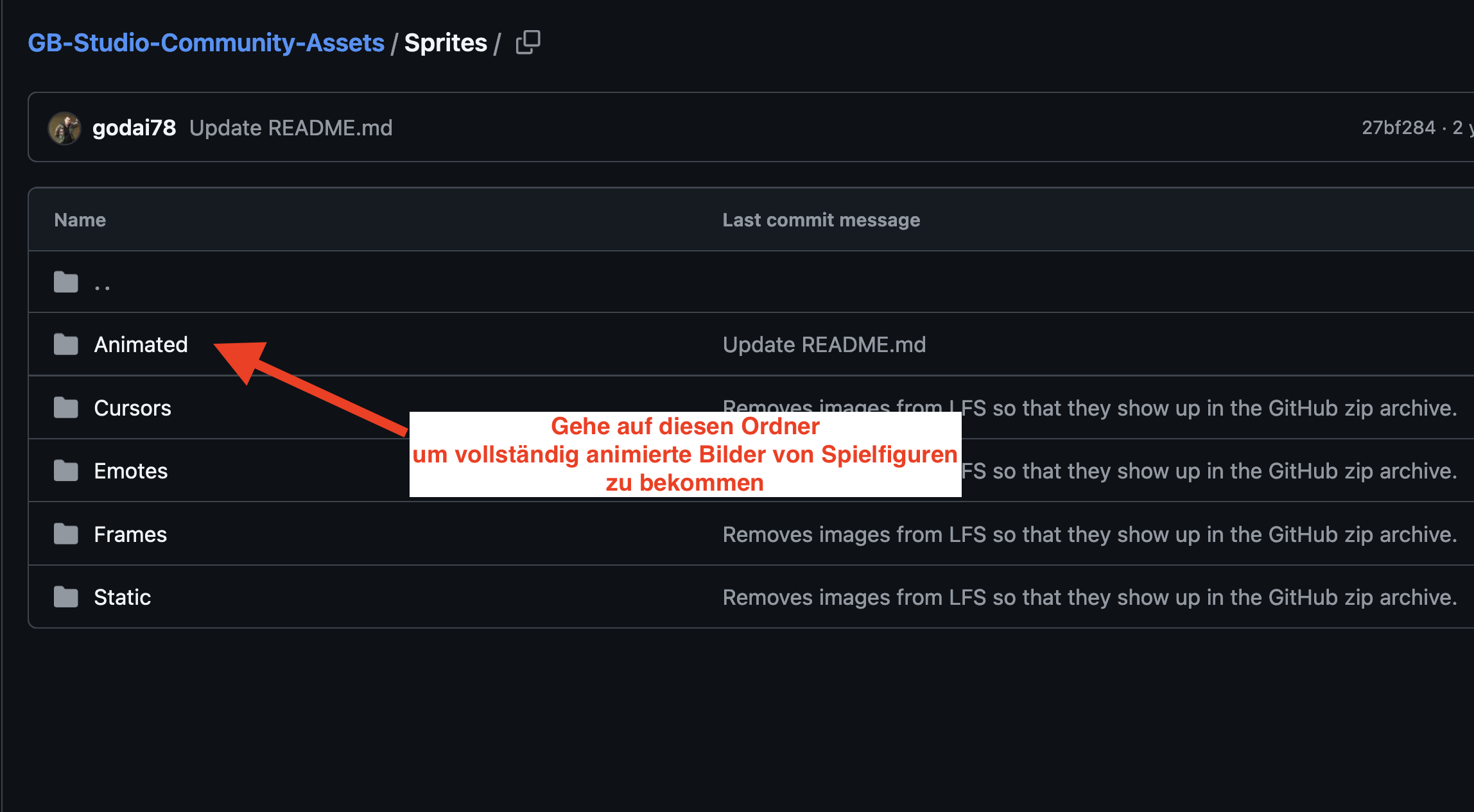 Du kannst nun im Ordner „Sprite“ nach gewünschten Bildern suchen. Lade sie herunter und kopiere sie anschließend vom Downloads-Ordner in den Sprite Ordner deines GB-Studio Projekts